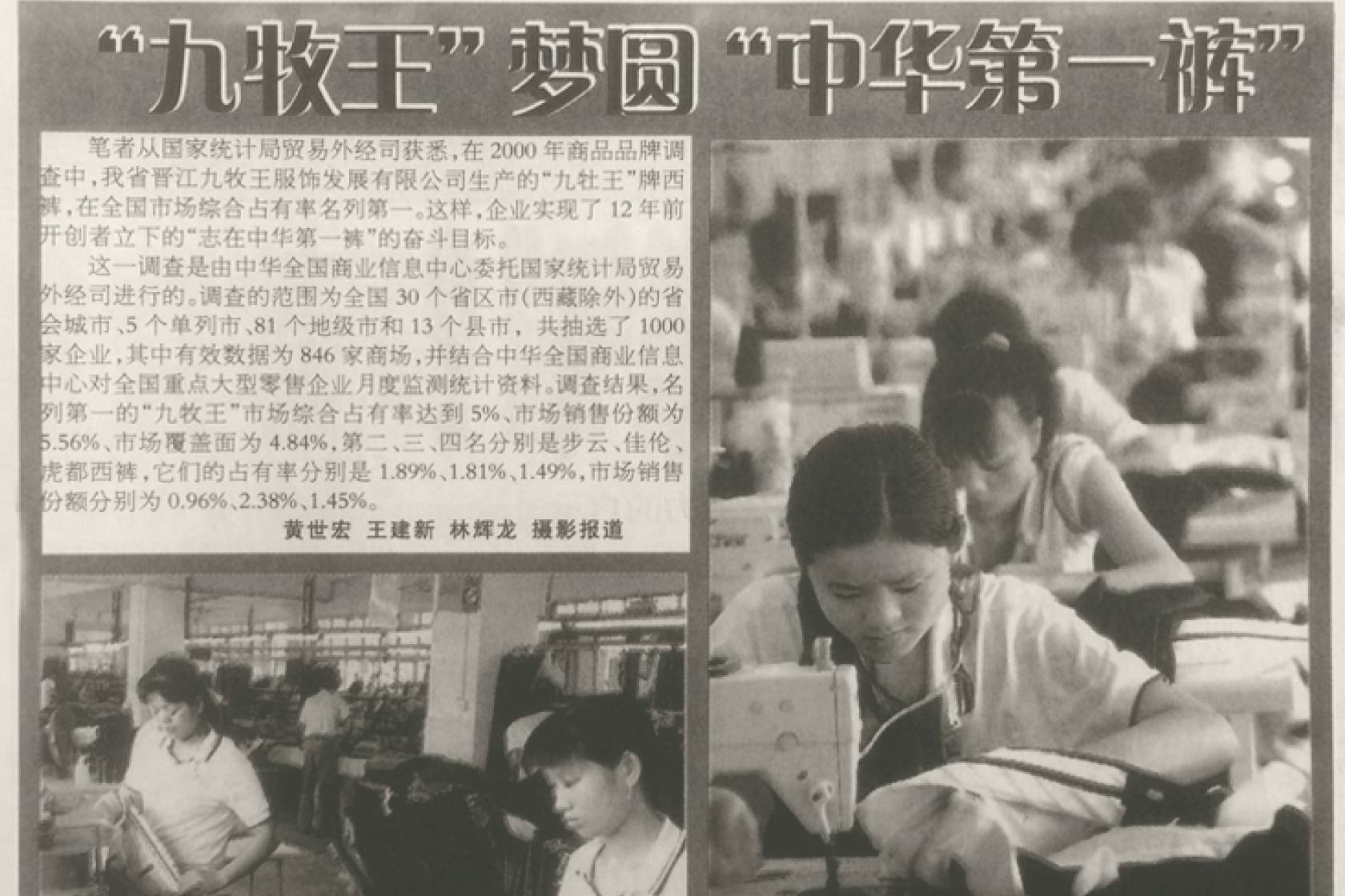 从12台缝纫机起家破旧的厂房内踏出了九牧王的第一步,没有设备,他们就去买了几台二手锁边机和裁床,剩下的缝纫机、剪刀、凳子全由工人自己带;即使条件再艰苦,还是要对工人进行了1个多月的培训才能上生产线,保证生产出来的裤子符合质量要求。